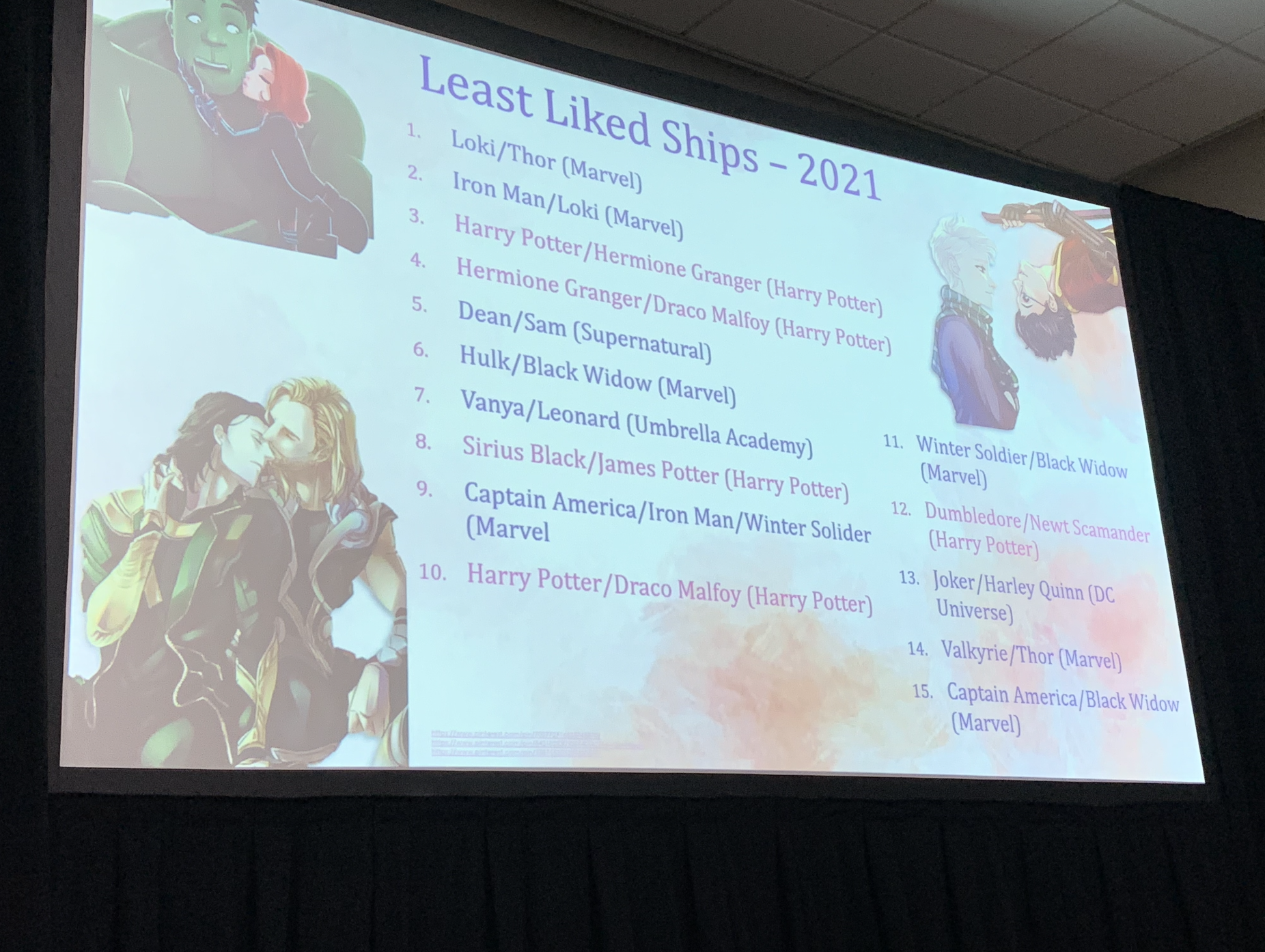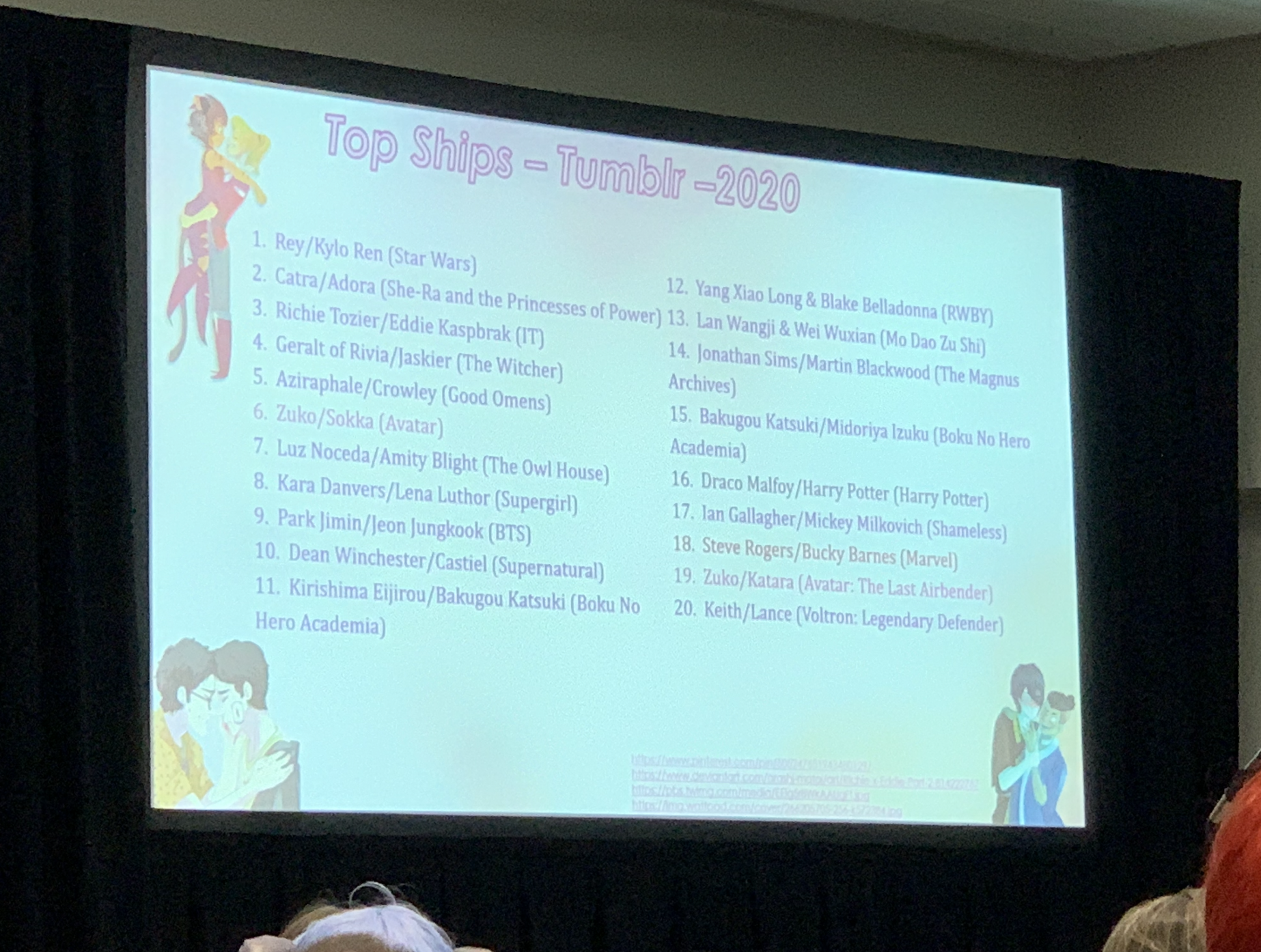 Y’all know I love mess so this was the one panel on the day that I could not miss. Turns out this was not just a fun exercise in looking at shipping, but a really fascinating dive into psychology and through data, how people’s affinities affect their shipping. I mean just look at these slides chile…some of yall need help! lol